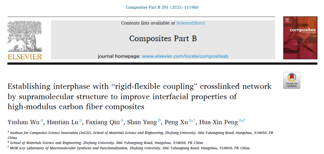 [浙里复材,杭州,2025211]  高强高模碳纤维增强树脂基复合材料因其轻质高强高模、尺寸稳定性好等优势在航空航天等领域广泛用于结构材料。然而,因高模碳纤维表面石墨化程度高、化学惰性强导致与树脂基体粘结性差,限制了复合材料的力学性能。浙江大学材料学院功能复合材料与结构研究的彭华新教授、许鹏研究员团队,成功地利用准聚轮烷超分子对高模碳纤维表面修饰,在复合材料高模碳纤维与树脂基体之间构建“刚柔耦合”界面相,从而显著提升了复合材料的界面性能和碳纤维的单丝拉伸性能。